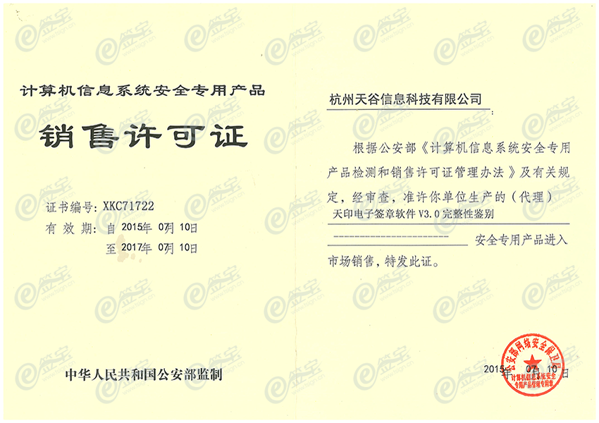 根据《中华人民共和国计算机信息系统安全保护条例》第十六条规定,公安部发布了《计算机信息系统安全专用产品检测和销售许可证管理办法》,《办法》第三条中华人民共和国境内的安全专用产品进入市场销售,实行销售许可证制度。安全专用产品的生产者在其产品进入市场销售之前,必须申领《计算机信息系统安全专用产品销售许可证》。